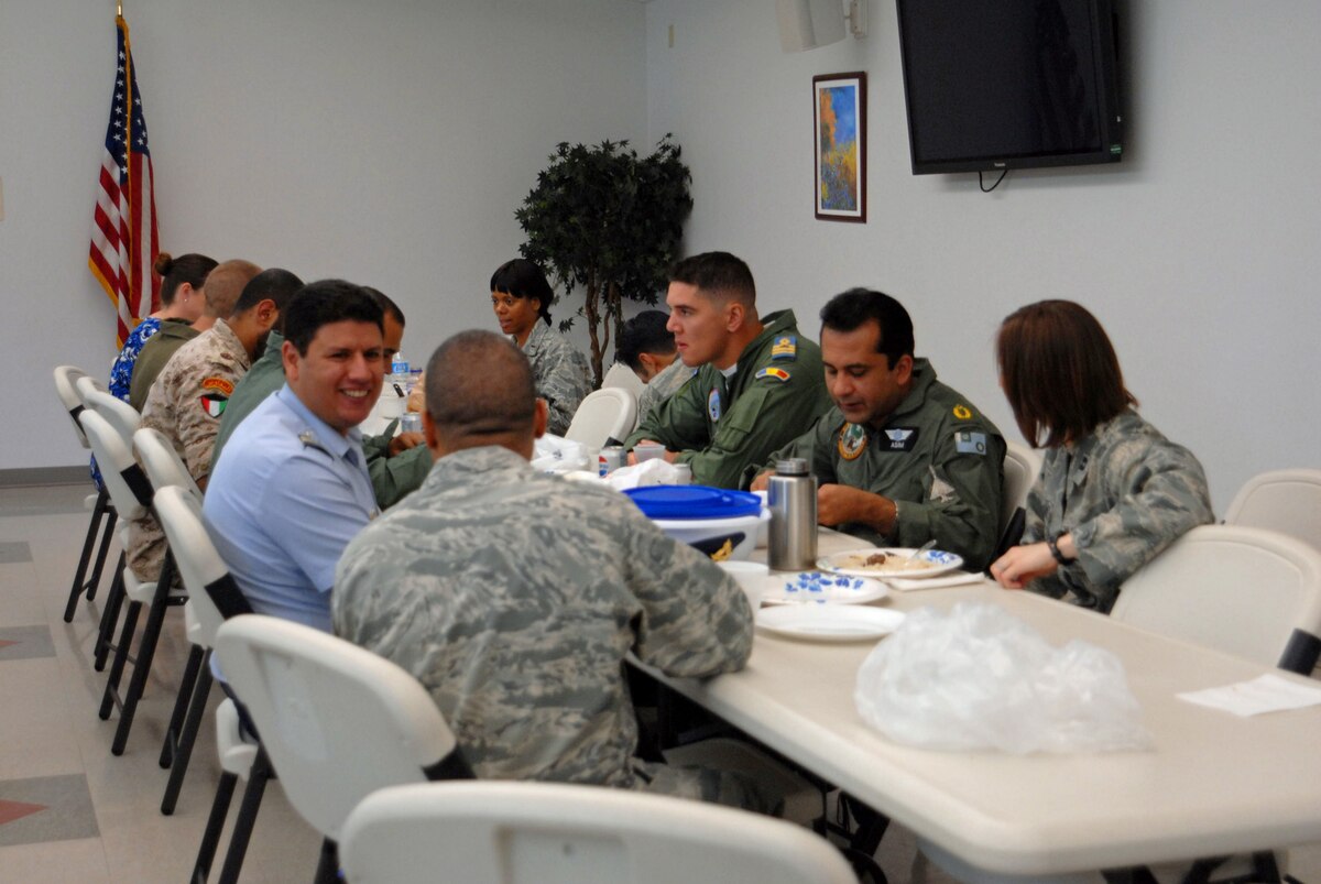 Goodfellow hosts International Student Brown Bag Luncheon Published June 25, 2013 By Airman 1st Class Breonna Veal 17th Training Wing Public Affairs GOODFELLOW AIR FORCE BASE, Texas -- Members of Team Goodfellow shared lunch with international students from the 315th Training Squadron for the International Student Brown Bag Luncheon June 18, at the base chapel. Team Goodfellow members learned the customs, foods and militaries of the foreign officers during the luncheon. "The purpose of this luncheon is to bring awareness tof the different cultures here," said Yalonda Folks, International Military Student Officer Chief. "We want the students to intermingle and meet new people." One of the dishes served, goat kabbash is a traditional Southwest Asian dish, and helped start the students' discussion about culture and food. It was a good chance to share cultures and meet new people, said one of the international military students. "The luncheons are a good way for our students to get involved in the community," added Folks. "It's also a good way for their sponsors to introduce them to an American way of life."