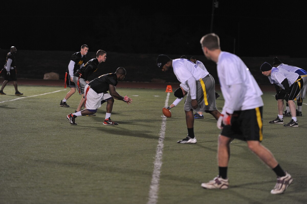 GOODFELLOW AIR FORCE BASE, Texas- The Junk Yard Dogs compete against The Combats in the Flag Football Intramural Championship game at the football field here, Dec. 12. The Junk Yard Dogs won the championship for the third time in a row. (U.S. Air Force photo/ Airman 1st Class Erica Rodriguez)