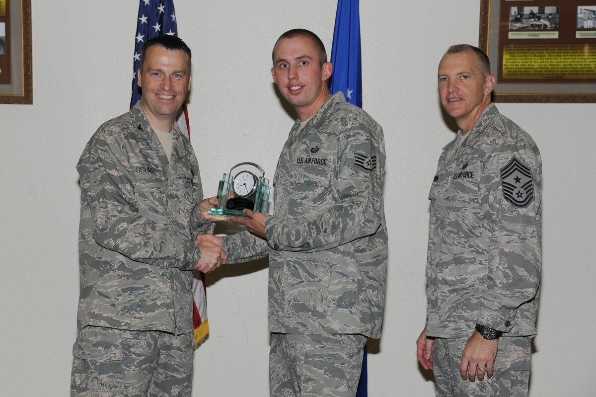 Col. Thomas Schmidt, 17th Training Wing Vice Vommander, and Chief Master Sgt. Scott Lumpkin, 17th TRW Command Chief, present the 17th Training Wing NCO of the Quarter to Staff Sgt. James Burns, 17th Force Support Squadron, during the wing quarterly awards ceremony July 24. (U.S. Air Force photo by Staff Sgt. Austin Knox)