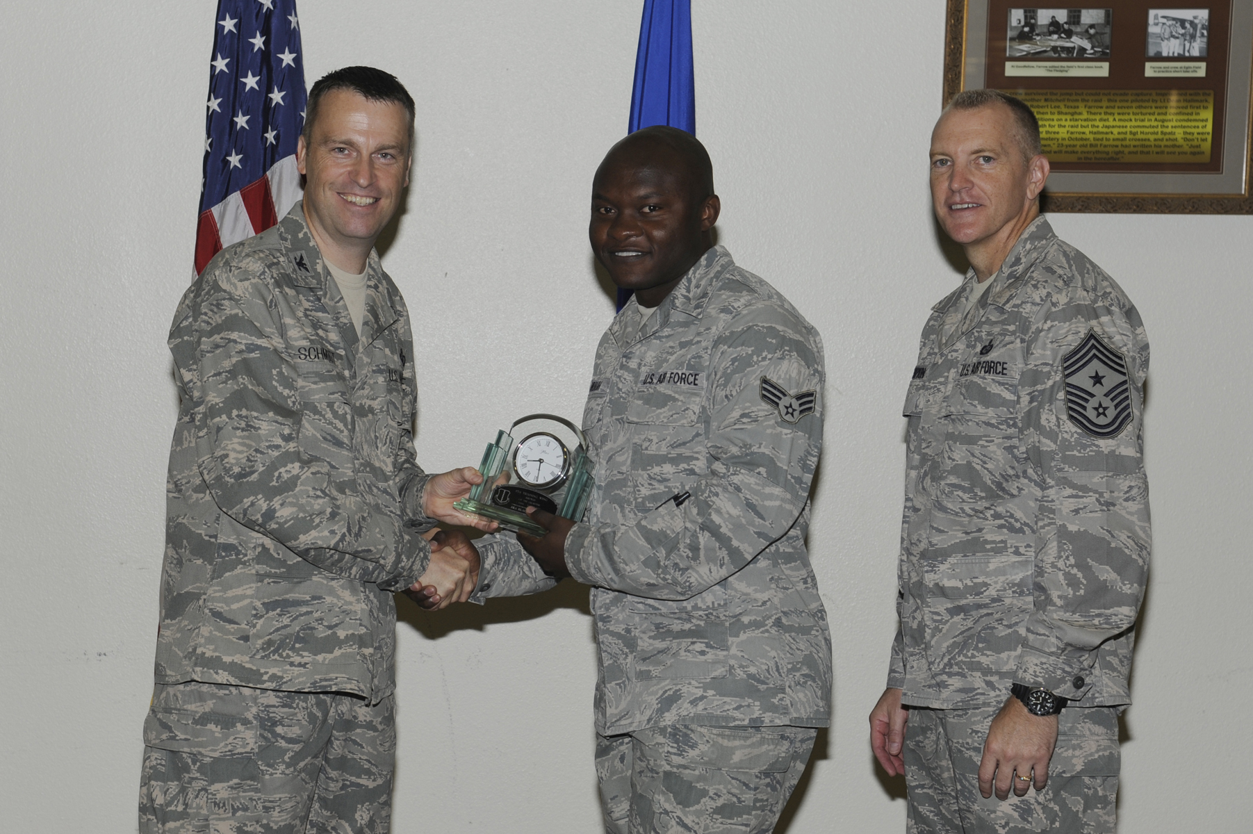 Col. Thomas Schmidt, 17th Training Wing Vice Commander, and Chief Master Sgt. Scott Lumpkin, 17th TRW Command Chief, present the Team Goodfellow Junior Enlisted of the Quarter to Senior Airman Blaise Muluh, 17th Medical Operations Squadron, during the wing quarterly awards ceremony July 24. (U.S. Air Force photo by Staff Sgt. Austin Knox)
