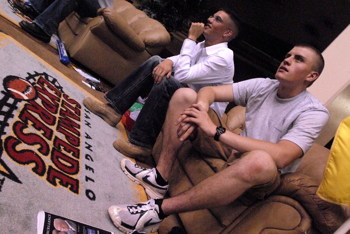 Airmen Basic Christopher Van Volkenburg and Joshua Brown watch the San Angelo Stampede Express football game from the best seats in town. (U.S. Air Force photo by Master Sgt. Randy Mallard)