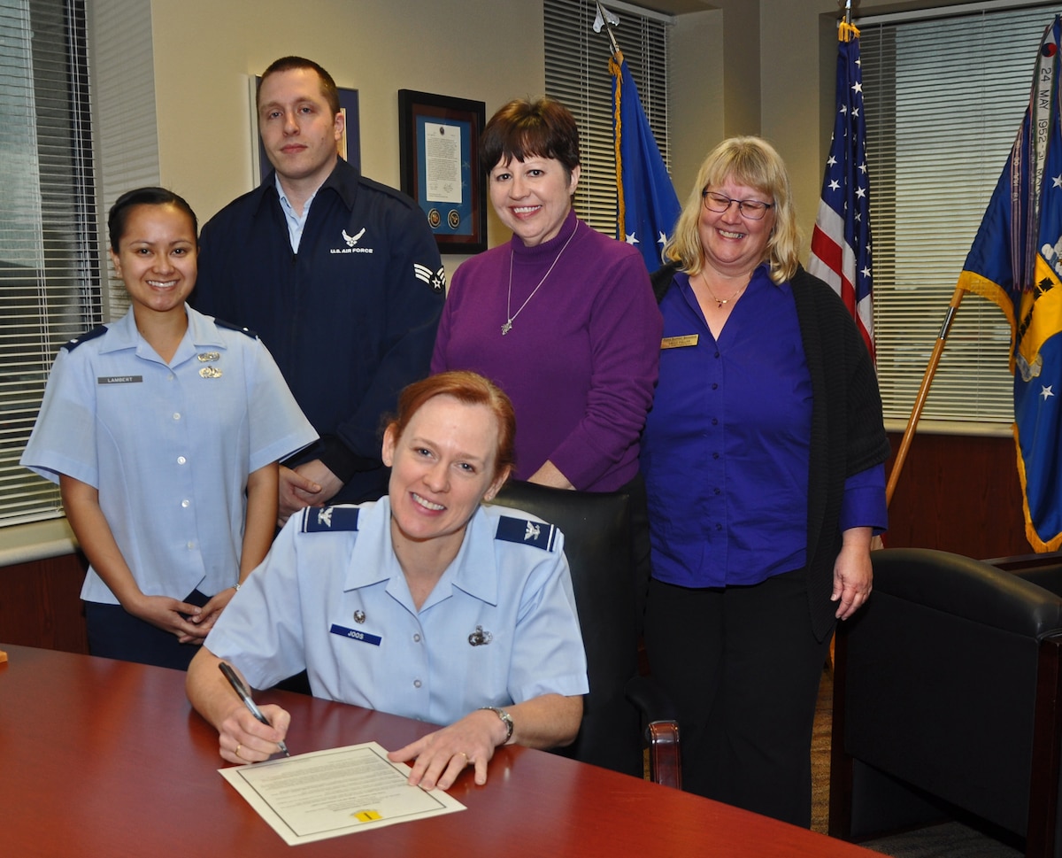 GOODFELLOW AIR FORCE BASE, Texas – (left) 1st Lt. Glenna Lambert, 17th Training Wing Sexual Assault Prevention and Response Deputy Chief, Senior Airman Eric A. Meshako, Alcohol and Drug Abuse Prevention and Treatment Program and Family Advocacy technician, Lori Matus, 17th TRW SAPR specialist, and Sally Fuller 17th Force Support Squadron Airman and Family Services Flight Chief, pose with Col. Kimberlee Joos, 17th TRW Commander, for the April 2014 Joint Proclamation signing in the Norma Brown Building here, March 24. The April proclamation marked the start of Sexual Assault Awareness Month, Month of the Military Child, Child Abuse Prevention Month and Alcohol Awareness Month. (U.S. Air Force photo/ Airman 1st Class Breonna Veal)