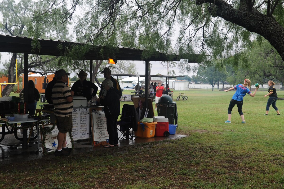 SAN ANGELO, Texas -- Tasters gather around the Tailgaters pavilion as youth partake in a game of football during the 40th Annual Armed Forces Chili Cookoff at the Goodfellow Air Force Base Recreation Camp Sept. 28. Team Tail Gate Party won the people’s choice award. (U.S. Air Force photo by Staff Sgt. Laura R. McFarlane)