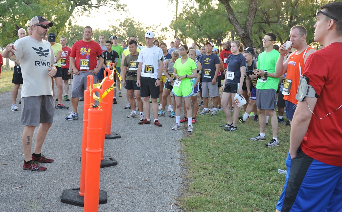 Army hosts 19th Annual Armydillo Published Aug. 28, 2013 By Airman 1st Class Joshua Edwards 17th Training Wing Public Affairs SAN ANGELO, Texas -- The Sentinel Foundation hosted the 19th Annual Armydillo at the Spring Creek Marina and RV Park Aug. 24, to help boost camaraderie between the Goodfellow units. The Armydillo features a 10k run, two-mile fun run and a formation run. The event attracted civilians, active duty and retired military members. "I came out to run and support the Armydillo, because I was Army," said retired Army Capt. Dr. Jerry Roach, Armydillo competitor. "I run every day because I enjoy it. It makes me feel good and keeps me healthy." Both the 10k and two-mile fun run started at 8:20 a.m and thirteen minutes later, Command Sgt. Maj. Matt Coppi, Army 344th Military Intelligence Battalion command sergeant major, crossed the finish line securing the first place spot for the two-mile fun run. Roach finished first in his age category of the 60 and over, for the two-mile run. "Today I looked around and didn't see anyone who could beat me," said Roach. "It depends on who shows up. If some of the right guys show up you're not going to win first. I ran a 16 minute and 3 second two-mile." 2nd Lt. Charles Thoennes, 315h Training Squadron student, placed first in the 10k run with a time of 37 minutes and 51 seconds. Once the 10k and two-mile run completed, the Army led the way in the two-mile formation run followed by the Marines, a civilian dressed formation and the Red, White and Blue team.