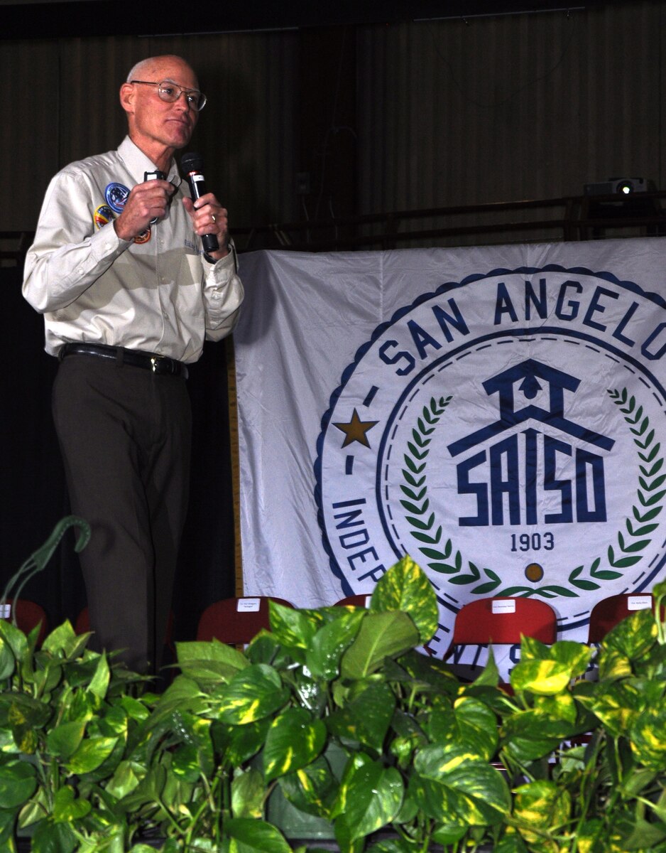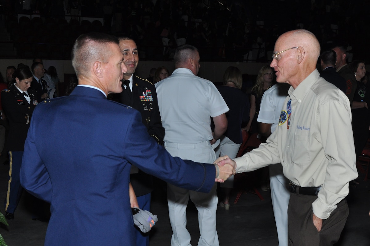 Wing leadership visit SAISD convocation Published Aug. 26, 2013 By Airman 1st Class Joshua Edwards 17th Training Wing Public Affairs SAN ANGELO, Texas -- Goodfellow leadership attended the San Angelo Independent School District convocation at the Foster Communications Coliseum Aug. 22. The SAISD event celebrates of the beginning of a new school year starting. The convocation featured band, choir and orchestra members from Central and Lake View High Schools playing the national anthem and "The Armed Forces Medley." Key notes speaker former astronaut Mike Mullane spoke of about his experiences in space and the importance of teamwork. "I think pretty ordinary people on pretty ordinary teams can do extraordinary things when they set the bar and are doggedly tenacious," said Mullane. After the convocation, Mullane met with Goodfellow commanders and senior enlisted advisors from the Army, Marine Corps, Navy and Air Force.