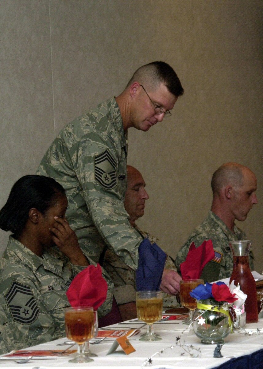 Chief Master Sgt. David Crane, 17th Training Group, chief enlisted manager, bangs his spoon on the table in appreciation during the 17th Training Wing Joint Enlisted Dining-In June 12. Clapping is forbidden at dinings-in, so participants use their spoons in lieu of applause. (U.S. Air Force photo by Senior Airman Stephen Musal)