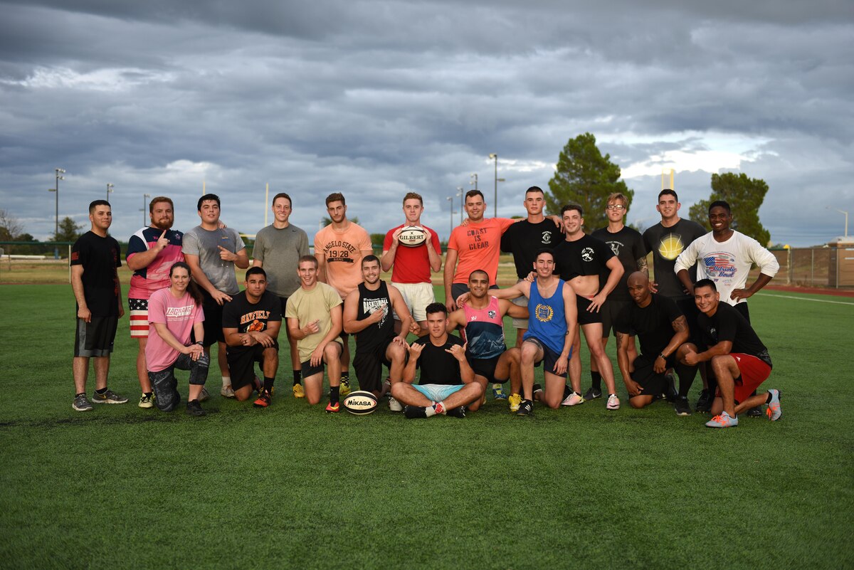 Rugby club members compete against each other during practice on the base softball field on Goodfellow Air Force Base, Texas, Aug. 17, 2016. In order to keep the players from being injured, the practice games are played by two-hand touches to simulate a tackle. (U.S. Air Force photo by Airman 1st Class Caelynn Ferguson/Released)