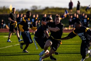 The U.S. Army 344th Military Intelligence Battalion went head to head with the U.S. Navy Center for Information Dominance Detachment in a game of flag football on Goodfellow Air Force Base, Texas, Nov. 24, 2015. The Army took home the trophy after winning in overtime with a final score of Army 13,