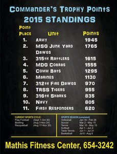 The Commanders Cup Program is an initiative to promote esprit de corps and participation in intramural sports throughout the year. All units and squadrons are eligible to compete in any or all of the nine sports offered.Each unit and squadron may submit two teams for each individual sport, with one
