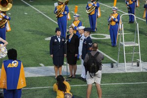 Angelo State University hosted a Military Appreciation Day football game Oct. 31. The event kicked-off with the presentation of the American flag by ASU ROTC cadets and Goodfellow Air Force Base service members as Patriotic Blue sang the national anthem. During the half-time event, the ASU marching