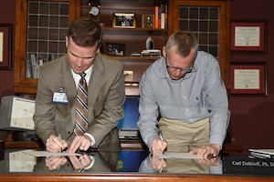 Dr. Carl Dethloff, San Angelo Independent School District superintendent, and Michael K. Buck, Concho Valley Workforce Development Board executive director, joined Thomas A. Baker Jr., 17th Force Support Squadron deputy director, at the SAISD administrative building to sign Memorandums of