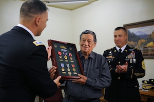Rep. Mike Conaway, 11th District of Texas, and Army 344th Military Intelligence Battalion leadership presented a World War II veteran with a folded flag and shadowbox at Kenny Blanek's Village Café here July 2.Earlier this year, former Army Cpl. Gilberto R. Torres, 83rd Infantry Division rifleman,