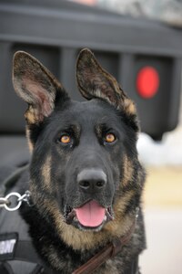 The 17th Security Forces Squadron honored Jork, 17th SFS military working dog, with a memorial ceremony Dec. 18. Jork, a 4-year-old German Shepard, passed away Nov. 21.Capt. James Nelson, 17th SFS Commander, presented Jork's certificate of military service to Staff Sgt. Amanda Goetz, 17th SFS MWD