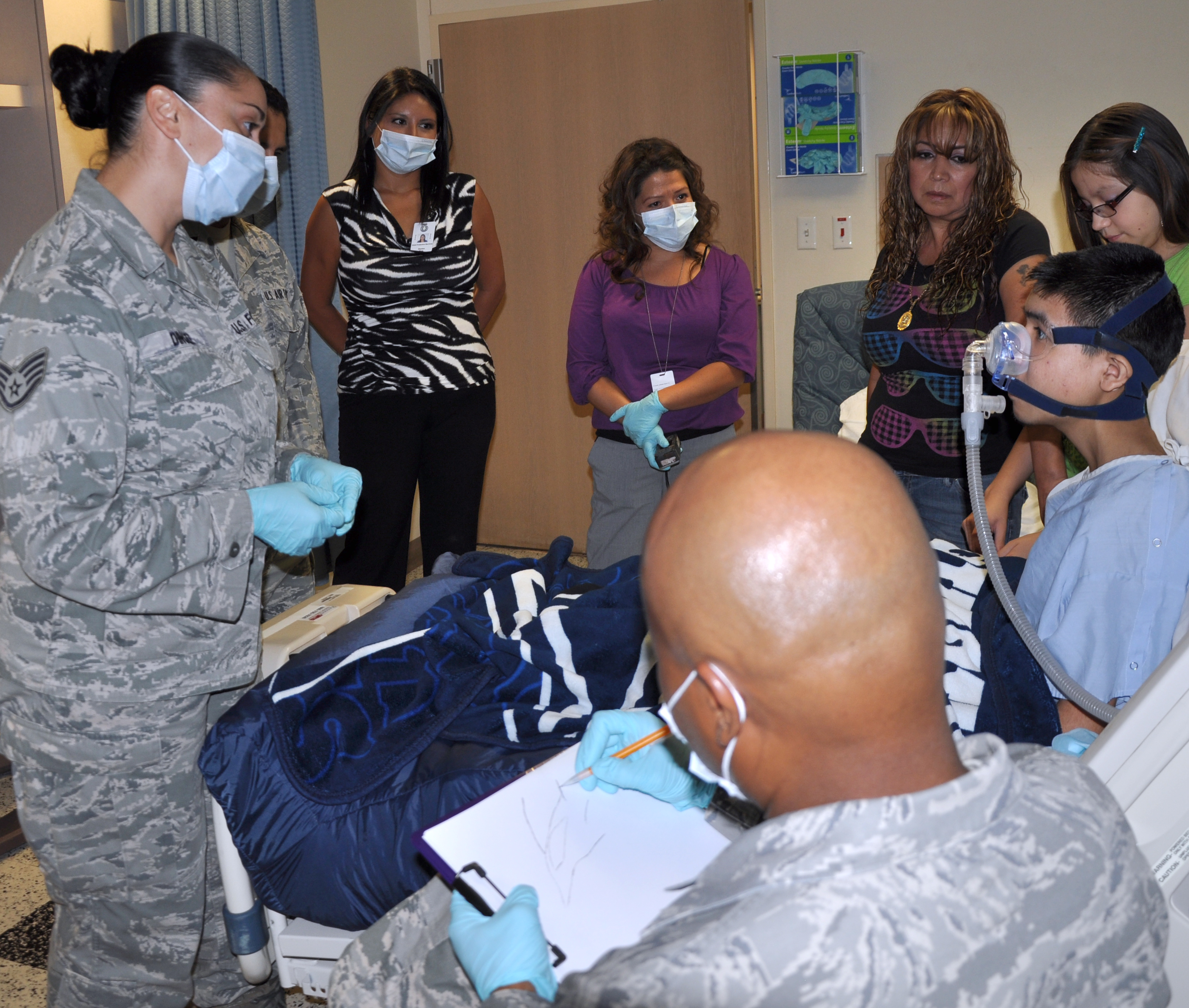 SAN ANGELO, Texas-- Master Sgt. Marvin Hawkins, 17th Medical Operations Squadron, draws a photo of a jet for Javier, 16, at the Shannon Medical Center Aug. 23. Javier, who has a terminal illness, was later presented with a certificate making him an honorary Airman and a command chief’s coin. (U.S. Air Force photo/Airman 1st Class Jessica Keith)