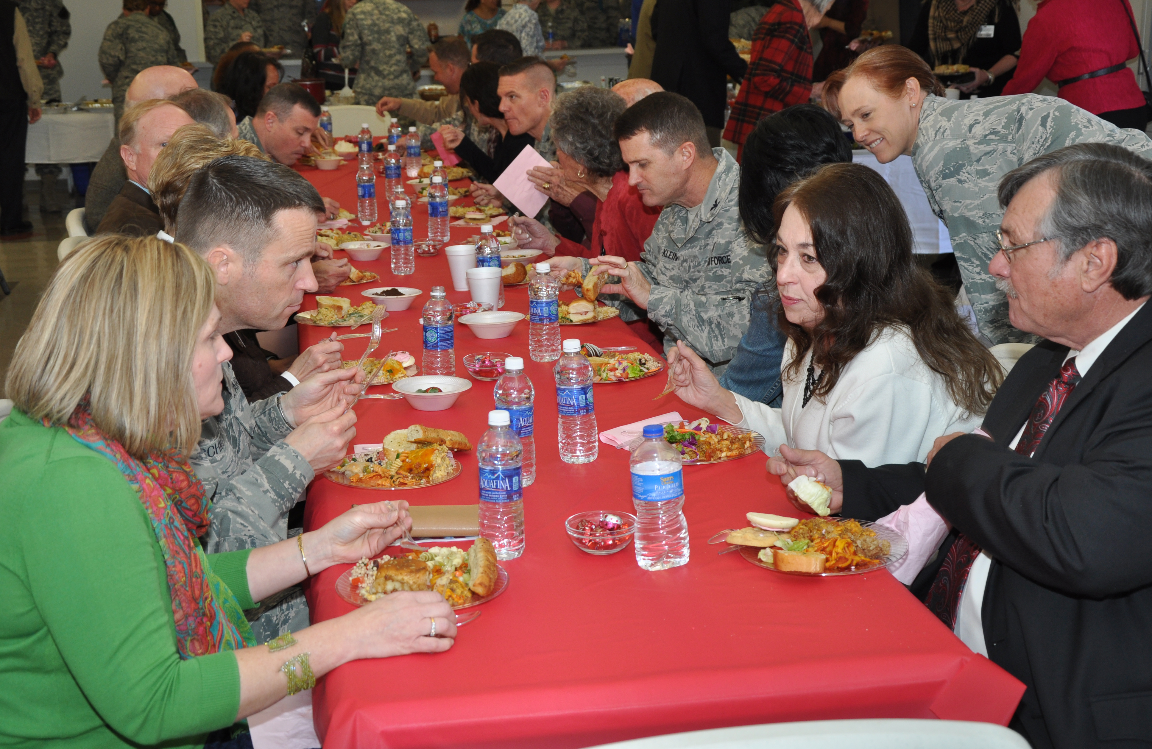 GOODFELLOW AIR FORCE BASE, Texas – The San Angelo Mayor Dwain Morrison talks with Col. Thomas Schmidt, 17th Training Wing Vice Commander, at the National Prayer Luncheon in the Taylor Chapel here Feb. 14. Morrison and Goodfellow members ate lunch, after base leaders prayed on topics important to the base including students and deployed members. (U.S. Air Force photo/ Senior Airman Joshua Edwards)