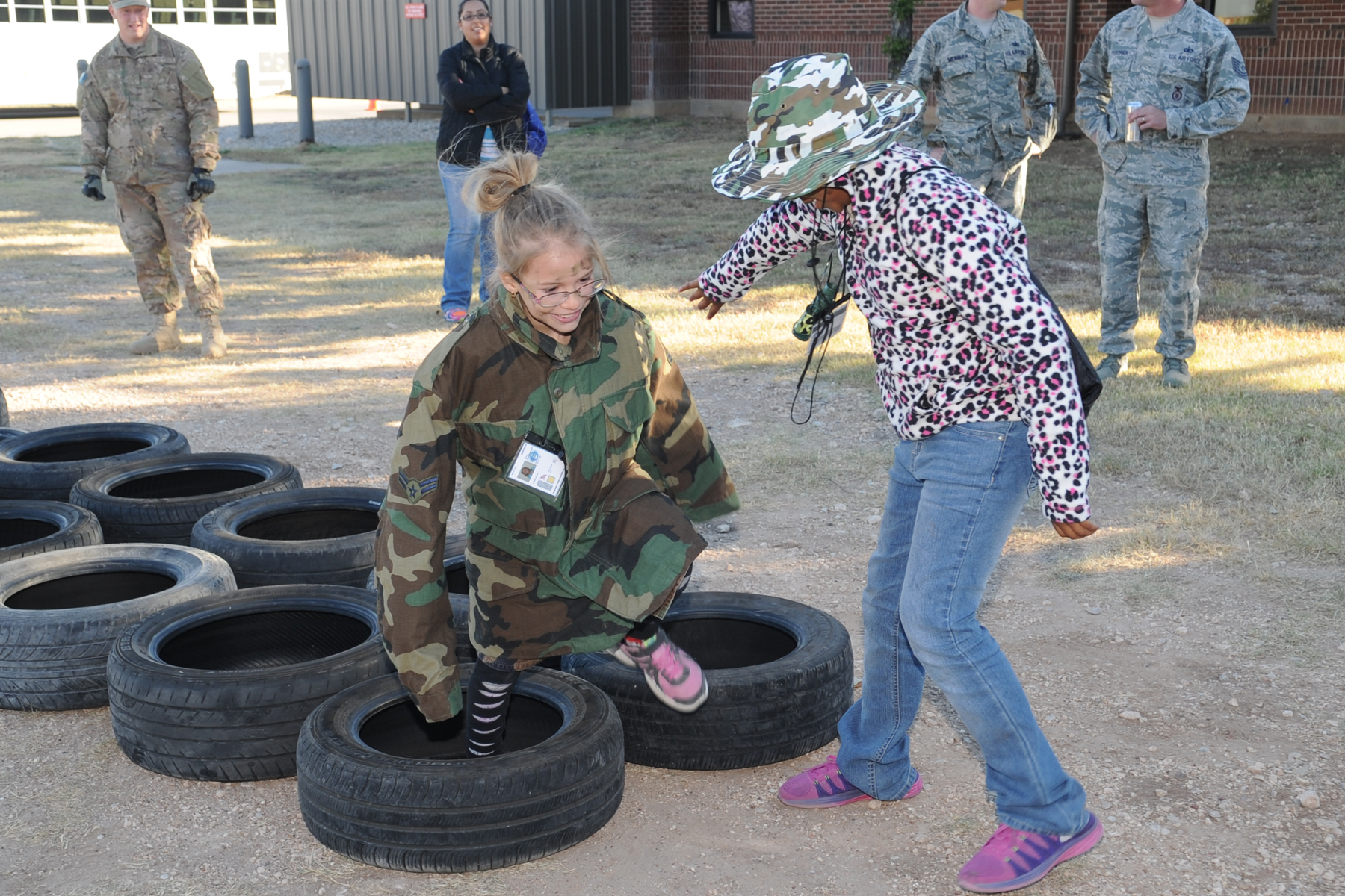 GOODFELLOW AIR FORCE BASE, Texas -- A youth helps her wingman complete the tire portion of an obstacle course designed to prepare the youth for their mock deployment during Operation KIDS Nov. 1. Operation KIDS is a group of activities designed to increase dependents' understanding of the deployment process. (U.S. Air Force photo/ Staff Sgt. Laura R. McFarlane)