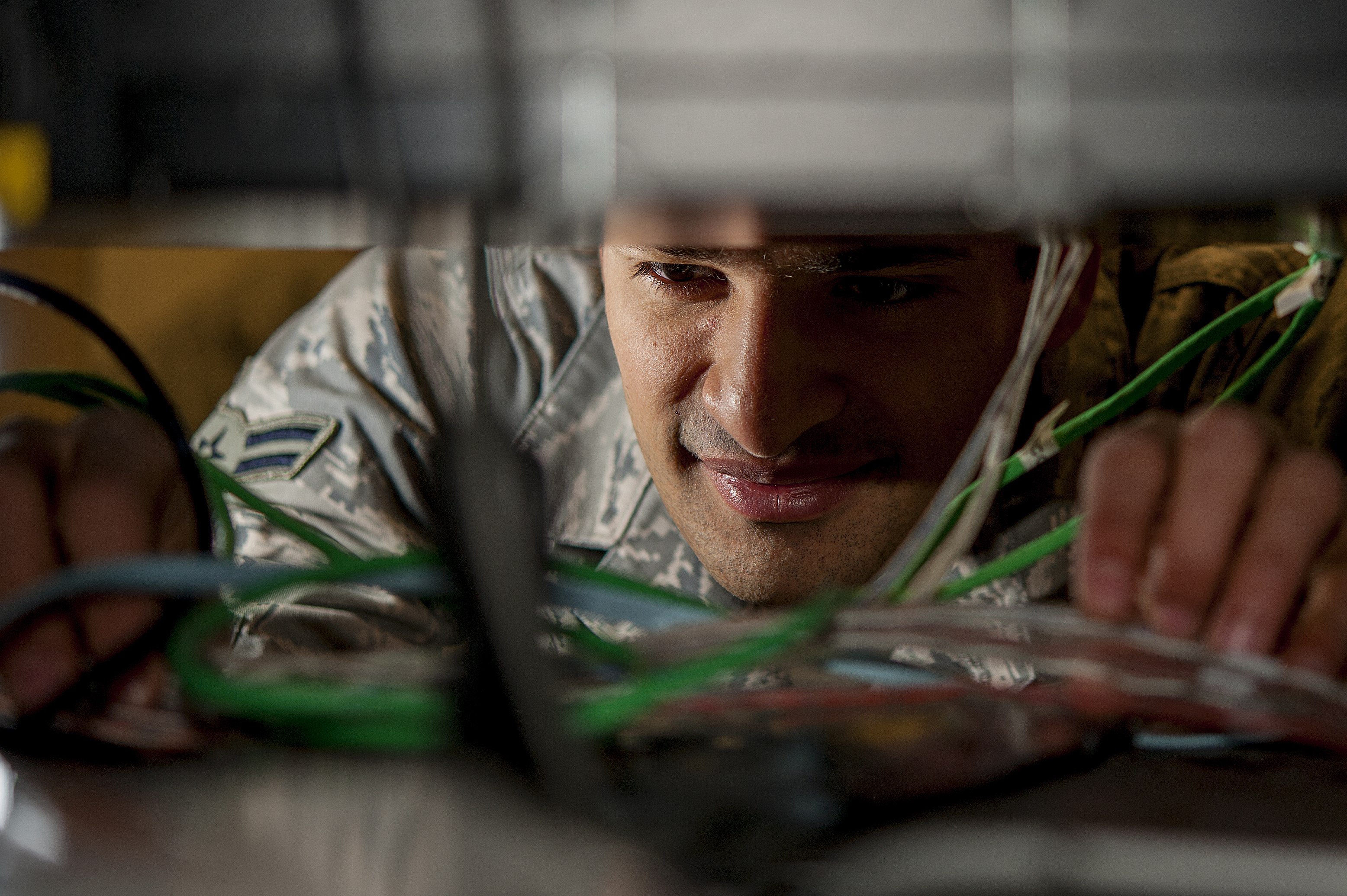 GOODFELLOW AIR FORCE BASE, Texas – Airman 1st Class Jamal A. Abed-Alkader, 17th Communications Squadron network operations technician, works on servers Jan. 27. Airman Abed grew up in Syria and joined the Air Force as a U.S. citizen. After serving his country, he plans to return to the Middle East as an American diplomat. (U.S. Air Force photo/ Airman 1st Class Devin Boyer)