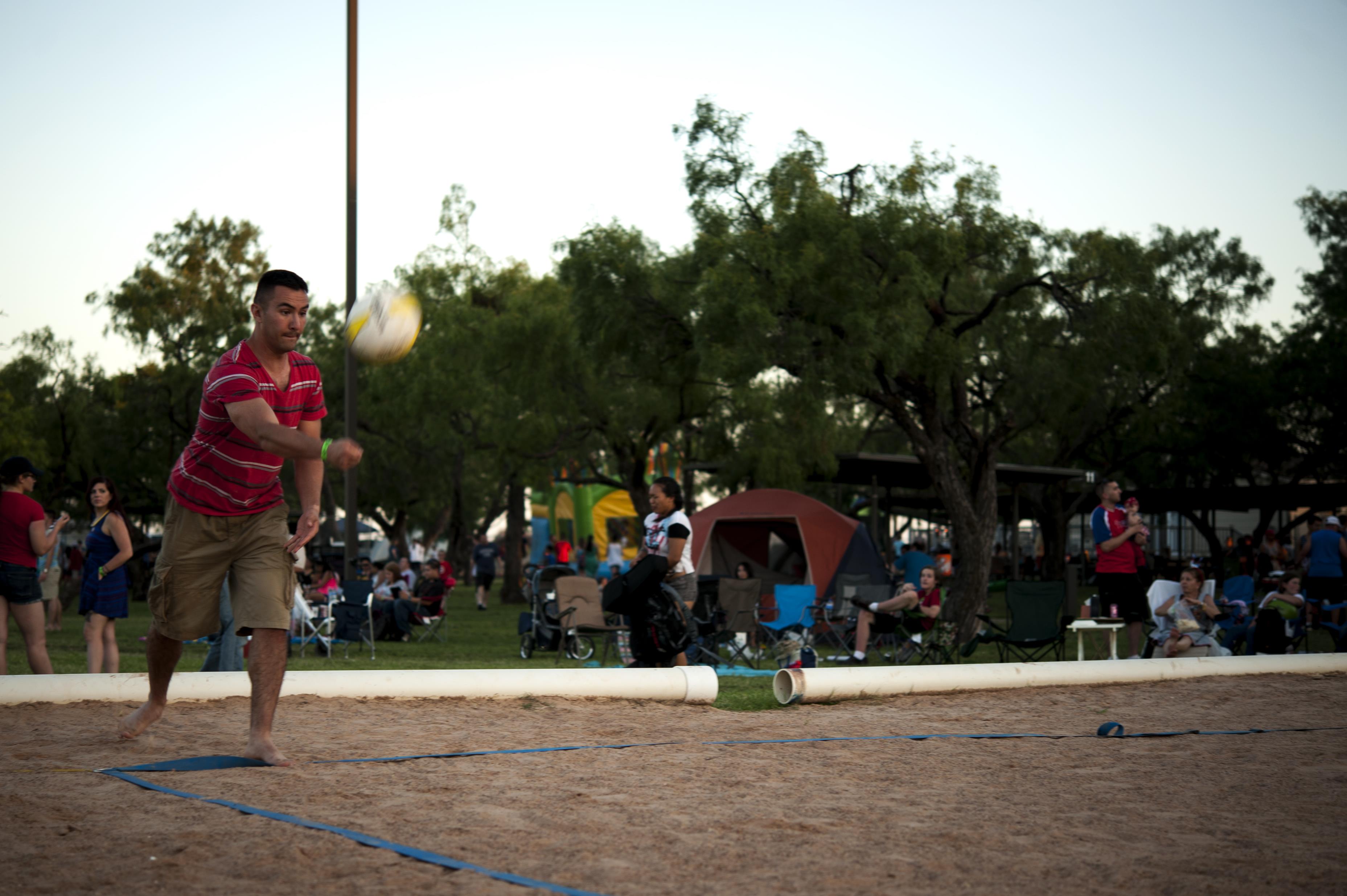 U.S. Air Force Airman Kyle Austin, 315th Training Squadron student, serves a volleyball during the 4th of July Party at the Goodfellow Recreational Camp, Texas, July 4, 2015. The hosted various activities for people of all ages. (U.S. Air Force photo by Senior Airman Scott Jackson/Released)