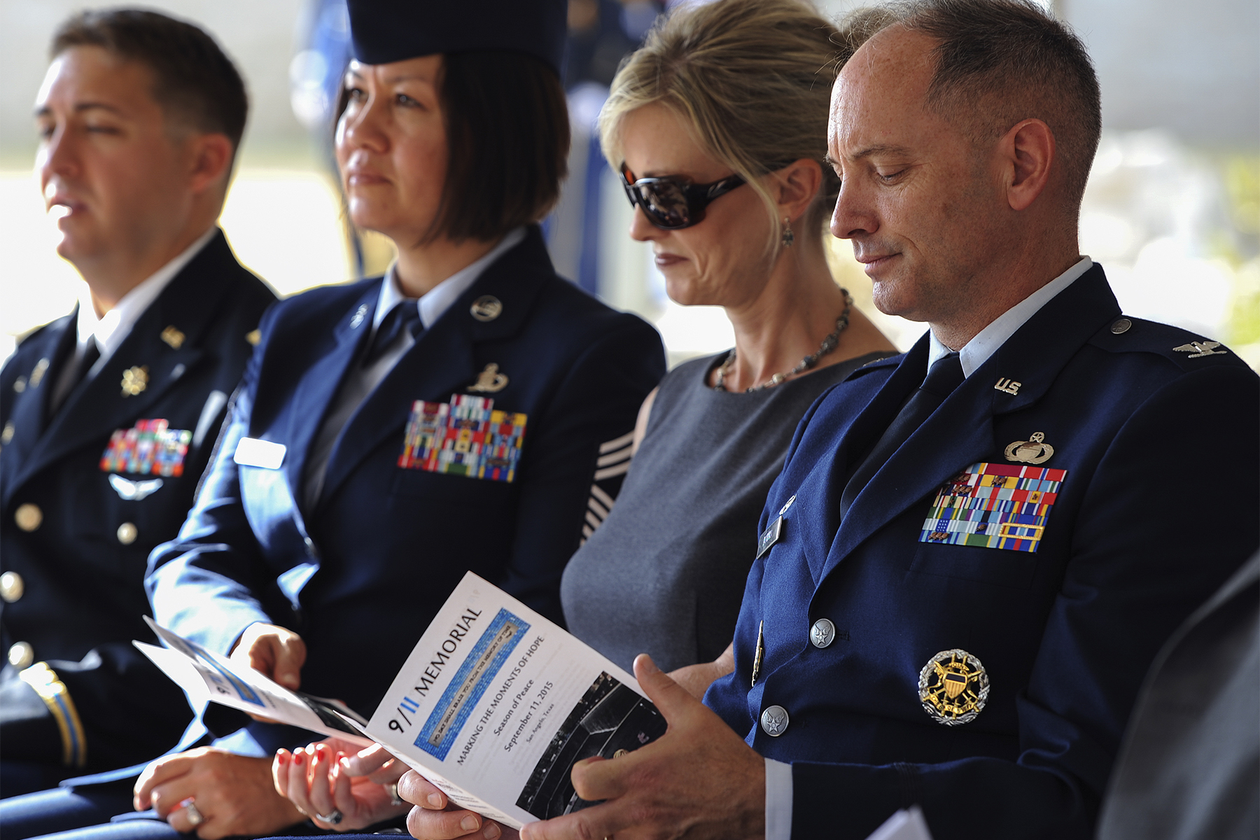 U.S. Air Force Col. Michael L. Downs, 17th Training Wing Commander, reads the program for the 9/11 remembrance ceremony hosted in San Angelo, Texas, Sept. 11, 2015. Goodfellow Air Force Base leadership represented the base as honored guests in the ceremony. (U.S. Air Force photo by Airman 1st Class Devin Boyer/Released)